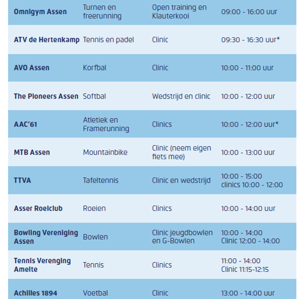 Ontdek op zaterdag 11 april tijdens de Open Sportclubdag welke sport(en) jij leuk vindt en welke sportverenigingen bij jou passen. Neem je stickerkaart mee en ga er samen op uit. Neem je broertje(s) of zusje(s) mee, ga met je ouder(s) of opa en/of oma eens kijken bij sportverenigingen in Assen. Misschien ken jij deze vereniging al wel, of ben je er nog nooit geweest. Overal ben je meer dan welkom en word je goed ontvangen. De ene vereniging heeft trainingen waar je aan mee kan doen, en de andere vereniging organiseert voor jou een clinic of een demonstratie. Elke vereniging doet het op haar eigen manier om jou te laten zien wat de sport en de vereniging inhoudt. Misschien kun je daarna tot de zomervakantie lekker meetrainen en kun je in september bij jouw nieuwe sportvereniging starten!