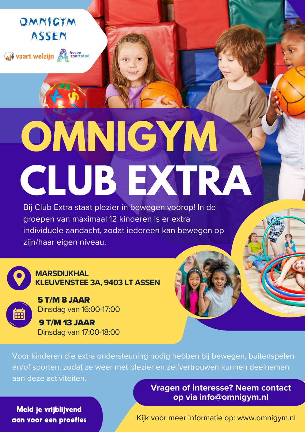 Sommige kinderen in de basisschoolleeftijd willen graag sporten, maar hebben hier meer moeite mee dan anderen. Ze hebben bv. beperkte motorische vaardigheden of zijn angstig, waardoor ze minder plezier ervaren bij de (gym)les op school of vereniging. Speciaal voor deze kinderen, die extra ondersteuning nodig hebben bij bewegen, buitenspelen en/of sporten heeft Omnigym Assen i.s.m. Vaart Welzijn en Assen Sportstad Club Extra lessen opgezet.